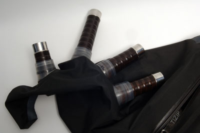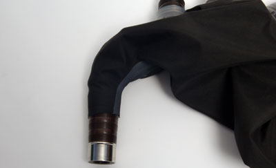Fitting the Chanter Stock Insert the chanter stock through the zip opening and ferrule first down through the chanter stock opening. As there is no rubber collar for the chanter stock, it will easily slide into position. There are 3 Methods of fixing the chanter stock into position. All of these methods are very secure and dependant only on preference or bagpipe set up. |