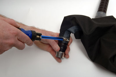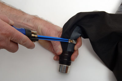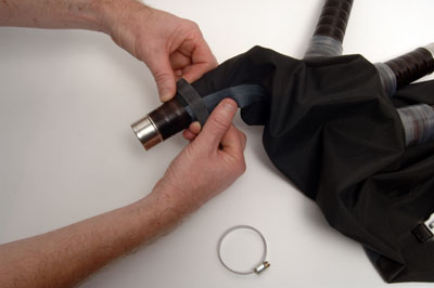 Place the hose clamp supplied over the 'O' Ring and gradually tighten. Ensure that the hose clamp remains level as it squashes down the 'O' Ring to give a perfect seal. When the hose clamp is secured in place, a piece of the rubber tubing supplied may be placed over the hose clamp to protect the bag from any damage. |