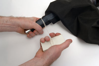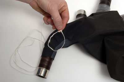 Go around the chanter stock firmly with the tying-in cord, using the block to keep the cord tight. Finish the tying-in process by threading the end of the tying-in cord through the small 'U' shape. Then grip the two tail ends of the 'U' shape loop and pull firmly to remove. |